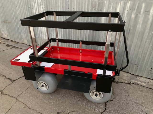 This wagon provides an additional 2 sq ft of space on the deck, yet it takes up the same amount of floor space as the 24″ x 48″ above. That’s because the widest point on these two wagons is the wheels themselves and not the deck surface. Standard features include your choice of 12″ Wheeleez® balloon tires or 15″ turf tires, 22 Ah battery and charger, LED battery meter, 2 keys, single rail system and a 90 AMP controller. Standard color is sand.
